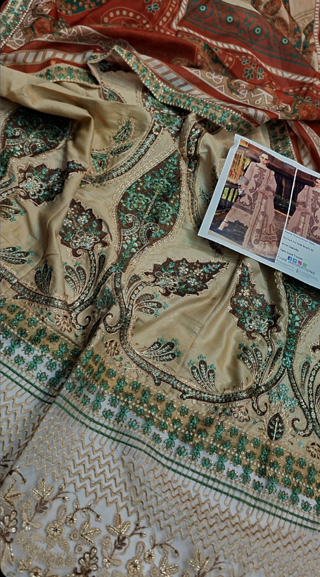 With its smooth, breathable fabric for all-day comfort, this lovely egg-white lawn suit is ideal for summer. A ready-to-wear silk printed dupatta in sophisticated tones of zinc, black, and light yellow on a white background is included. Available for 4350, this elegant, light, and graceful item is a great choice for your winter wardrobe.